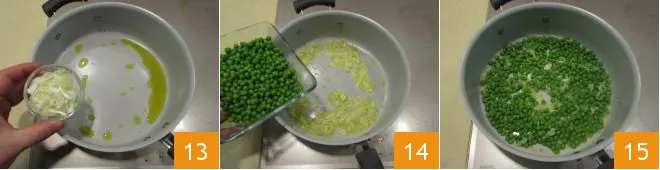 In the meantime, start preparing the filling for the tricolor savory pie. Thinly slice the spring onion, fry it in a pan with two tablespoons of oil 13 and let it brown over moderate heat 14. Add the peas, salt, pepper, and cook over low heat until tender 15.