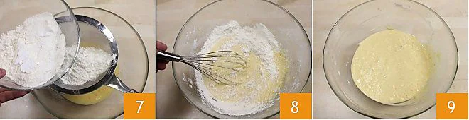 continuing to stir, add the sifted flour mixed with baking powder 7, mixing well to combine the ingredients 8 using a whisk until the mixture reaches a smooth and homogeneous consistency 9.