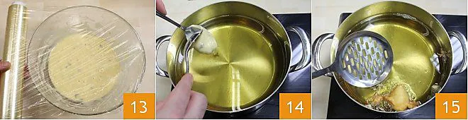 cover the bowl with plastic wrap and let it rest for half an hour 13. Pour oil into a pan with high sides and heat it until it's hot but not boiling; take an amount of dough about the size of a walnut with a spoon 14 and, with the help of another spoon, let it slide into the hot oil. Once the dough is immersed in the oil, turn the tortello so it cooks and puffs up evenly on all sides.