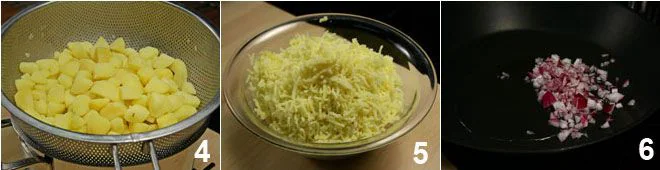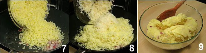and add the mashed potatoes 7 and grated cheese 8, cook for a moment and then transfer to a bowl 9