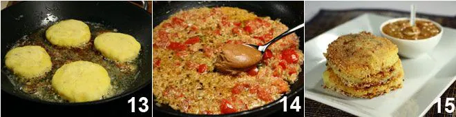 take a tablespoon of the mixture at a time 10 and form flat cakes with the help of your hands 11, coat them well in cornmeal 12 so they remain crispy when cooked.