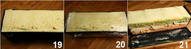 then cover again with the whole wheat sandwich bread 16 and proceed with the composition of the last layer with the pesto spread 17. Cover with the last layer of white sandwich bread. To completely cover the surface of the loaf, cut a slice into strips of thickness 18