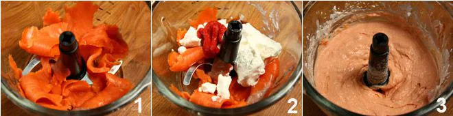 First, prepare the spreads. In a blender, place the salmon 1, add the ricotta cheese and the tomato paste 2 to make the salmon spread 3 and set it aside.