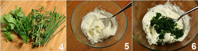 Then proceed with the herb mousse, finely chop the aromatic herbs 4, add the fresh spreadable cheese (5-6) and mix well until everything is completely combined.