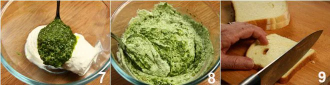 Then prepare the spread with pesto 7 by adding it to the ricotta cheese and mix well again 8. Once the spreads are prepared, proceed to assemble the bread layers. Cut the crusts from the slices of sandwich bread and from the slices of white bread 9