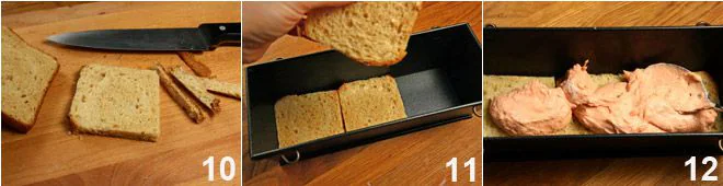 and also from the whole wheat bread 10 and place it at the bottom of a loaf pan 11 measuring 10x3.5x2.75 inches, preferably with a removable bottom, then spread the salmon spread 12