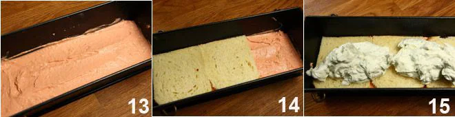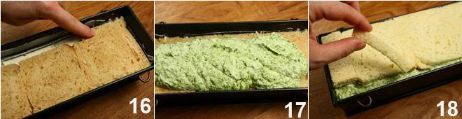 smooth it well with a spatula 13 and cover with slices of white sandwich bread 14, then spread the herb spread proceeding as with the first layer 15,