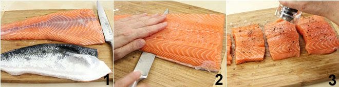 To prepare the salmon fillet with tomatoes and thyme, start by skinning 1 and deboning 2 the salmon from which you will obtain 4 cutlets to salt and pepper 3.