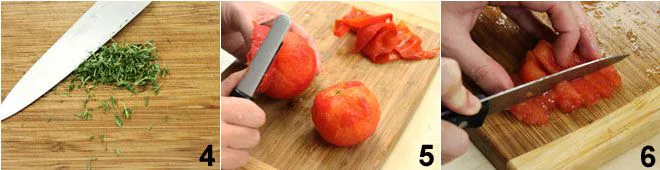 Now, chop the thyme 4 and set aside 4 sprigs. Wash the tomatoes and blanch them in boiling water for about 15-30 seconds. When the tomatoes are cold: peel them 5, remove the excess water, and dice them 6.
