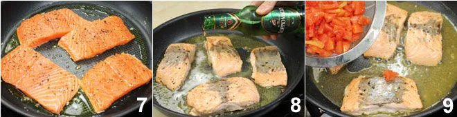 Place the salmon cutlets in a non-stick pan with a bit of oil 7 and cook over high heat for 2 minutes on each side with a crushed garlic clove. Now, deglaze with the double malt beer 8 and let it evaporate until you obtain a thick sauce. Add the tomatoes 9 and chopped thyme and let cook for about 5 minutes (do not overcook, the tomatoes should not fall apart). Serve your salmon fillet and its dressing on a serving plate and garnish with thyme sprigs.