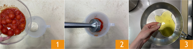 To prepare the trofie with cod sauce, start by desalinizing the capers (just rinse them well under running water), then pour the canned cherry tomatoes into a tall jug 1 and blend them with an immersion blender until you get a smooth sauce 2. In a large pan, heat a little oil and sauté the garlic clove in its skin 3.