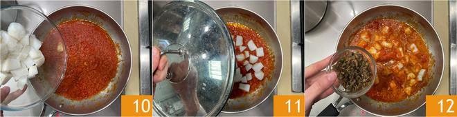 Add the cod to the tomato sauce 10, stir and continue cooking with the lid on for another 5 minutes or until it softens (it should flake when touched with a spoon) 11. At the end of cooking, add the chopped capers and olives 12.