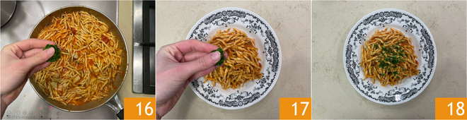 Turn off the heat, season with the chopped parsley 16, toss everything with a drizzle of oil and dish up your trofie with cod sauce adding more finely chopped fresh parsley to taste 17 18.
