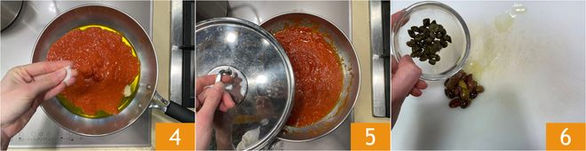 Then pour in the cherry tomato sauce, season with salt 4 and pepper, and cook covered for about 20 minutes 5. On the cutting board, place drained Taggiasca olives and desalinized capers 6.