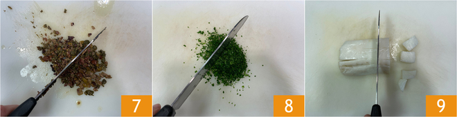 Chop everything finely with a knife 7, then do the same with the parsley 8. Set aside and dice the cod fillet 9.