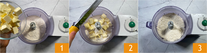 To prepare the tropical tart, start with the Shortcrust pastry: in a food processor fitted with blades combine the flour with cold butter cut into cubes 1 and the grated lime zest 2, then pulse until you obtain a sandy mixture 3.