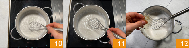 Place over the heat and cook for about 10 minutes, stirring constantly 10; if it begins to boil, remove it from the heat. When the cream has thickened 11, turn off the heat and add the gelatin 12.