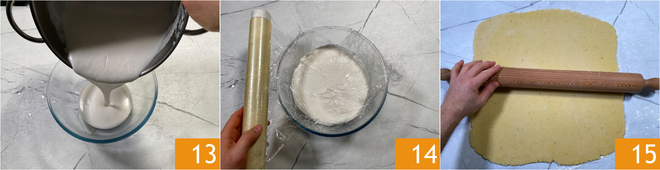 Pour the cream into a bowl 13, cover with plastic wrap directly on the surface and let cool in the refrigerator for at least one hour 14. After the pastry's resting time, roll it out to about 3/16 inch (0.20 in) thickness on a lightly floured surface 15.