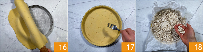 Transfer the dough to a removable-base tart pan with a 10 5/8-inch (27 cm) diameter, buttered and floured 16, then prick the base with a fork 17. Cover with a sheet of parchment paper, add dried legumes (or ceramic pie weights) and How to do blind baking at 338°F for 20 minutes 18.
