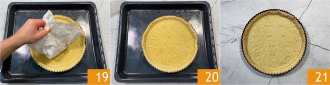 After the baking time, remove the parchment with the weights 19 and continue baking for another 10 minutes at 356°F 20. Remove from the oven and let the base cool 21.