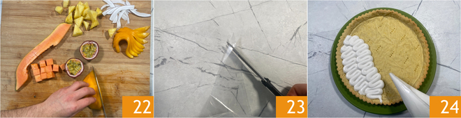 Move on to decorating: clean the fruit, then cut: the pineapple into triangles, the papaya into cubes, the coconut into thin slices with a vegetable peeler and the mango into thin strips 22. Cut the tip of a piping bag on the diagonal 23 and fill it with the cold coconut cream. Then fill the tart base with the cream, creating a decorative pattern 34.