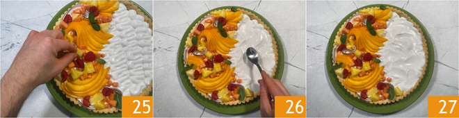 Arrange the fruit pieces on top, including the raspberries and a few mint leaves 25, then give the cream a little movement with the back of a teaspoon 26. Your tropical tart is ready to be served 27!