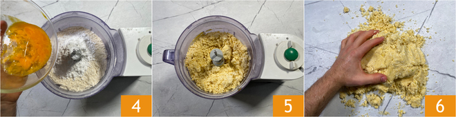 Add the powdered sugar and the eggs 4 and pulse the processor for a few more moments 5. Transfer the mixture to the work surface and quickly knead by hand 6, just long enough to form a dough. Wrap it in plastic wrap and chill in the refrigerator for one hour.