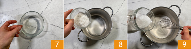 Move on to the coconut cream: soak the gelatin in cold water 7. Mix the rice flour and sugar in a saucepan 8, then pour in the coconut milk while whisking to prevent lumps 9.