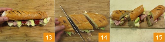 close with the other half of the baguette 13 and cut the filled baguette diagonally into three equal parts 14, serve your tuna and avocado bread bites immediately 15.