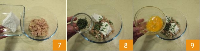 Meanwhile, prepare the meatball mixture: pour the tuna into a bowl, add the ricotta 7, chopped thyme and marjoram 8, and the previously beaten egg 9.