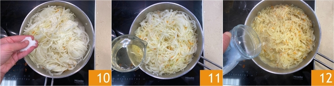 Add salt 10, then mix well. Pour in the white wine 11 and let the alcohol evaporate, stirring gently. At this point, add the vegetable broth until the ingredients are just covered 12.