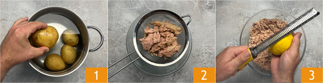 To prepare the tuna meatloaf, first boil the potatoes 1 for 20 minutes or until they become soft. Meanwhile, drain the tuna 2, place it in a bowl, crush it with a fork into small pieces, then add the lemon zest 3.