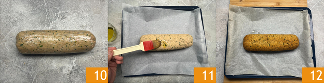 Transfer the mixture to a work surface and form a loaf about 4x10 inches, wrap it in plastic wrap, pressing well to compact it and close it like a candy 10. Let it rest for a few minutes. Place it on a baking tray lined with parchment paper, and gently remove the plastic wrap. Brush with oil 11 and bake in a preheated convection oven at 392°F for 35 minutes. Your tuna meatloaf is ready to be enjoyed 12.