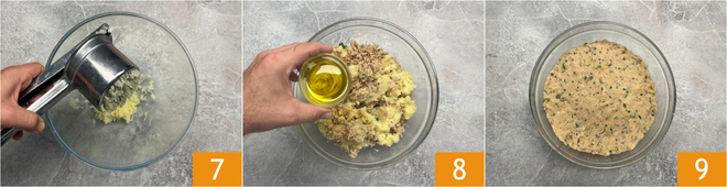 Mash the potatoes 7 and add them to the tuna. Also add the oil 8 and mix the ingredients well to obtain a homogeneous and compact mixture 9.