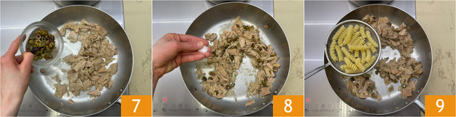Add the capers and olives 7, season with salt 8, and mix to combine the ingredients. Drain the pasta directly into the pan 9.