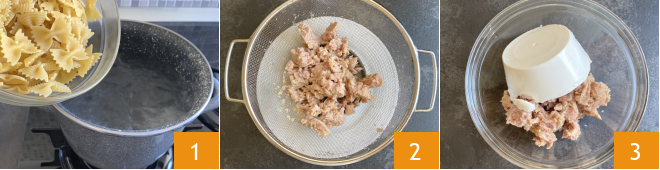 To prepare tuna pasta, first of all, put a pot with plenty of water on the stove. When it reaches a boil, salt it and add the pasta 1, which should be cooked for the time indicated on the package. Meanwhile, take care of the sauce: drain the tuna in a bowl 2, then add the ricotta 3.