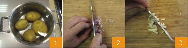 To make the tuna samosas, first wash the potatoes, place them in a pot of cold water, and boil them for about 40 minutes 1, until you can easily pierce them with a fork. Meanwhile, prepare the other ingredients: peel and finely chop the shallot 2 and the garlic clove 3,