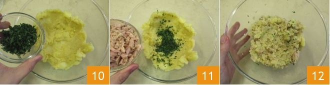 Let the potatoes cool slightly, then transfer them to a bowl; add the chopped parsley 10 and drained tuna 11, and mix well to combine all the ingredients 12.