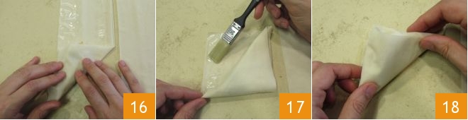 and fold the dough so that the base aligns with one of the sides, forming a triangle 16. Continue folding the dough this way until you reach the opposite end of the strip; at this point, brush the sides with a little water 17 and seal the parcel by gently pressing with your fingers 18. Proceed in the same way with the remaining phyllo strips, being careful not to overfill them to prevent the filling from spilling out during frying.