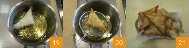 After assembling all the samosas, heat the vegetable oil in a saucepan to a temperature of 340°F and fry one piece at a time for about 3 minutes, turning it on both sides 19. As soon as the phyllo dough turns golden brown, drain the samosas with a slotted spoon 20 and transfer them to a sheet of paper towels to drain excess oil: your crispy tuna samosas are ready to be enjoyed 21!