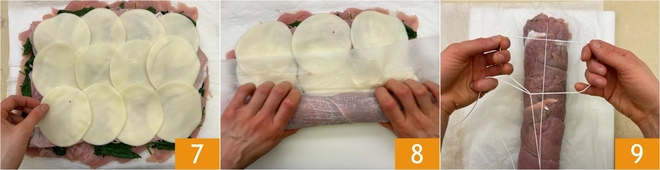 Finally, add the slices of provolone cheese 7. Roll everything from the longer side using the parchment paper to help 8, you should obtain a tight and compact roll. At this point, seal the roll obtained with string: first tie it lengthwise, then create loops a couple of fingers apart from each other 9.
