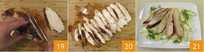 Take the turkey, slice it to a thickness of about 0.4 inches for each slice (19-20), and distribute it on the bed of fennel 21.