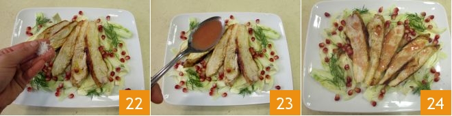 Garnish with the pomegranate seeds set aside, sea salt flakes 22, and drizzle with the pomegranate and oil emulsion 23; your turkey slices with fennel and pomegranate are ready to be served 34.