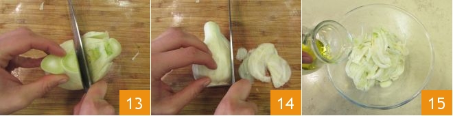 Cut it in half, then slice it finely (13-14), and transfer it to a bowl to season with 2 tablespoons of oil 15, salt, and pepper.