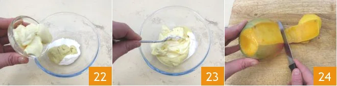 And the mayonnaise 22, and mix to obtain a homogeneous sauce 23. Return to the salad: peel the mango 34,