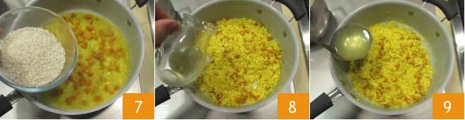When the onion has softened, add the rice 7 and toast it for a few minutes until it turns transparent. Deglaze with the white wine 8 and let it evaporate completely, then continue cooking the rice by adding a ladle of hot broth at a time 9 and stirring often.