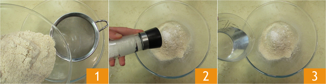 To prepare the Tuscan fritters, start by heating the water in a saucepan. In a large bowl, pour the chestnut flour 1 and a pinch of salt 2. The water should be hot but not boiling, pour it into the bowl slowly 3 and stir simultaneously.