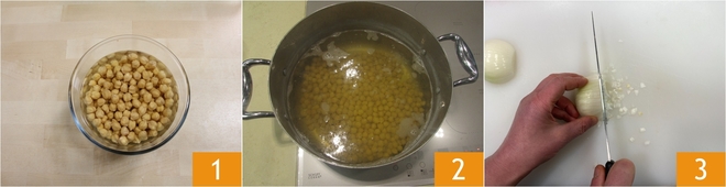 To prepare the Tuscan kale and chickpea soup, first soak the dried chickpeas for 8–12 hours 1, then drain them and transfer them to a pot, covering them with water 2. Add a bay leaf and cook until tender; generally this takes about 60–90 minutes, depending on the quality and how long they were soaked. In the meantime, peel and chop the onion 3.