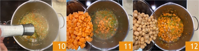 Season with salt 10 and add the sweet potatoes to the soffritto 11. Let them absorb the flavors for a few minutes, then add half of the chickpeas 12 and stir.