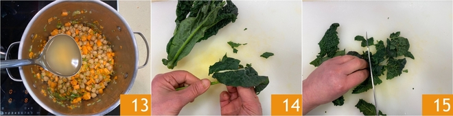 At this point cover with hot vegetable broth 13 and cook for about 20 minutes, until the sweet potatoes are tender and begin to break down slightly 13. Meanwhile, prepare the Tuscan kale: remove the tougher central ribs 14 and slice the leaves into strips 15.